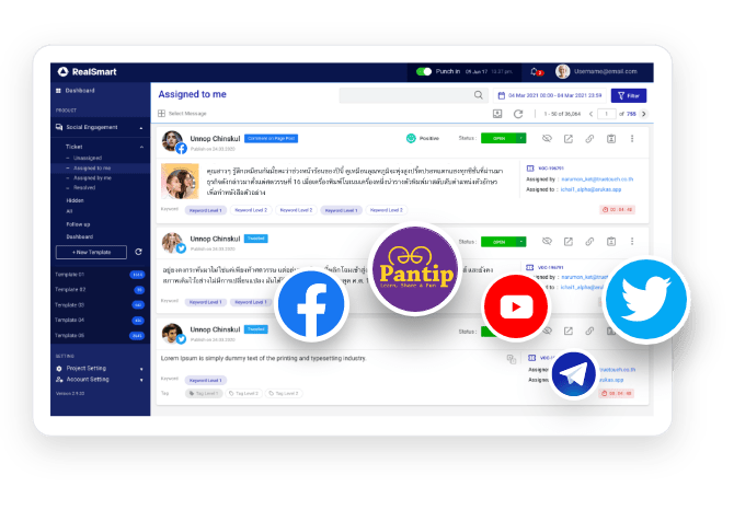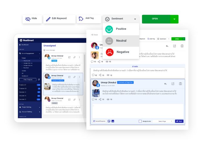 Real engagement ช่วยให้คุณตอบกลับความคิดเห็นและข้อความค้นหาจากช่องทางโซเชียลมีเดียทั้งหมดของคุณได้ในแพลตฟอร์มเดียว