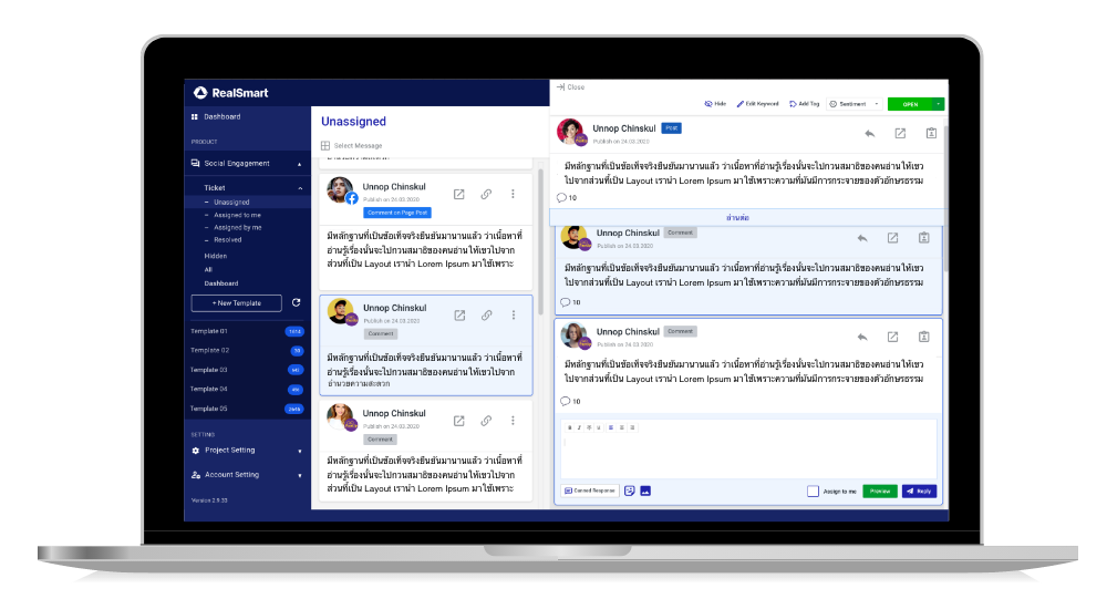 Real Engagement ช่วยให้คุณตอบกลับความคิดเห็นและข้อความค้นหาจากช่องทางโซเชียลมีเดียทั้งหมดของคุณในแพลตฟอร์มเดียว ดังนั้นคุณสามารถมอบประสบการณ์ลูกค้าที่เหนือกว่าและความพึงพอใจของลูกค้าที่เพิ่มขึ้นสำหรับแบรนด์ของคุณ